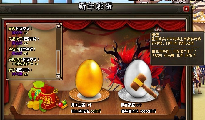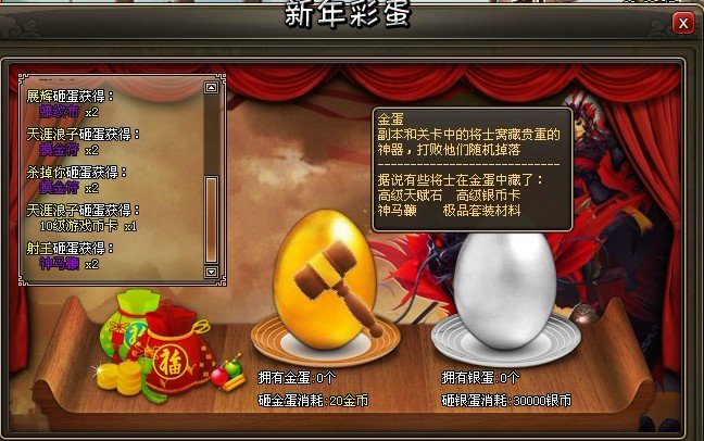 金蛋奖励:高级天赋石、高级银币卡、神马鞭、极品套装材料