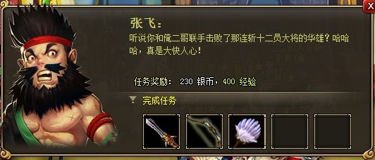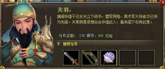 在游戏里这时候我们会接到一个任务,进攻汜水关,关羽自告奋勇地要会会华雄此人。完成任务可以获得230的银币、400的经验还有三个职业的10级武器。