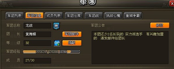 我接手军团的管理之后,做了第一个痛苦的决定,清除掉团里的非战斗力,踢掉了像星星等一些很热情但是没战力的,朋友兄弟,我想他们一定很记恨我吧,可我只能在此深深的说声对不起,为了军团的发展只能委屈你们了,对不起.......