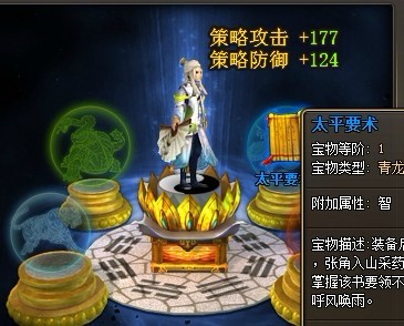每个武将可以装备四个宝物,提升的空间是相当的大的如下图,太平要术+150智力,可以增加177的策略攻击及124的策略防御。当然还有加力量加敏捷加生命这些不错的宝物,嘿嘿,短时间提升武将能力,过关斩将是你不二的选择噢。